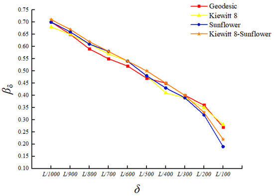 As it is plotted in Figure 6, when the IGDM is L/1000, the defect coefficient βδ is about 70% for four kinds of reticulated shell structures, which means that the stability critical load (SCL) drops around 30%. With the increase in IGDM, the values of βδ decrease gradually with the nearly linear trend until the IGDM arrives L/300. Afterwards, the βδ falls sharply to a small magnitude finally (around 17% for the lowest value). This is because, as we mentioned in Section 4.2, as long as the IGDM is over L/300, the SFS transfer from the state is dominated by the internal film force to the situation controlled by the bending moment, which indicates that the shell structure is not so stable anymore, leading to the tremendous reduction in SCL. Therefore, in a word, it is assumed that the defect coefficient βδ is sensitive to IGDM δ in this work.