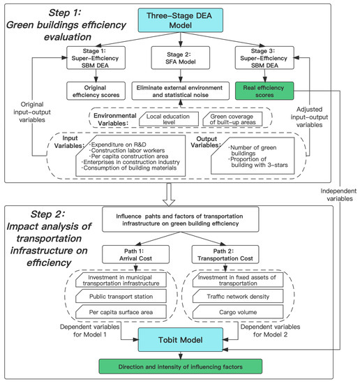 The empirical analysis of this paper is divided into two parts. Firstly, the super-efficiency SBM model was combined with the three-stage DEA model in which the impact of slacks and external environmental factors on the efficiency measure was considered so as to evaluate the static input–output efficiency of green buildings in each province more accurately. Secondly, the Tobit model was adopted to carry out regression with green building efficiency values as independent variables and transportation infrastructure indicators as dependent variables. The results obtained by the Tobit model are the degree and direction of the impact of transportation infrastructure on the efficiency of green buildings. The above two-step analysis could provide the methods and paths to improve the efficiency of green buildings based on adjusting the layout of transportation infrastructure. The frame diagram is shown in Figure 1.