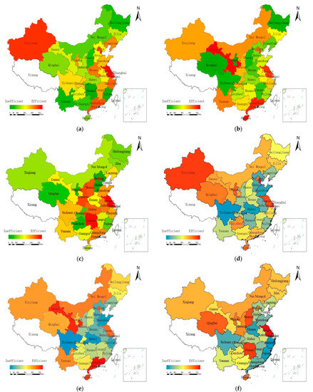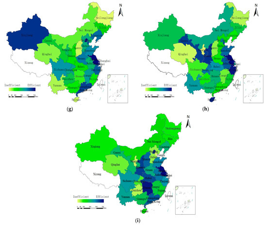 Figure 3d–f show the distribution of PTE (pure technical efficiency) of green buildings. The distribution and tendency of PTE are different from that of TE. High-efficiency provinces are always distributed in northwest China, and the efficiency level of neighboring regions is also high, indicating that the effect of the cluster of PTE in northwest China plays a role. At the same time, PTE gradually converges from coastal and frontier areas to the center over time. Low efficiency provinces shifted from being concentrated in the central region to spreading to the southeast. Specifically, most provinces in the east, except Jiangsu province, Guangdong province and Hunan province, were in a depressed state of inefficiency, indicating that the radiation effect in the central and eastern regions was poor.