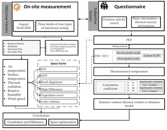 This study concerns the main urban area of Chongqing, a mountainous high-density city, as the research object. We have collected actual measurement data during the high-temperature heat waves, analyzed the thermal environment from the urban spatial perspective, combined the PET human comfort evaluation index, explored the correlation between PET and thermal environment elements at each measurement point, verified the unity of human subjective thermal perception and objective model analysis, calculated the outdoor thermal comfort in summer through a regression fitting range, established the outdoor thermal comfort evaluation model during a summer heat wave in high-density urban centers, investigated the effect of thermal parameters on human thermal comfort, and have drawn final research conclusions. The methodological framework of this study is shown in Figure 1.
