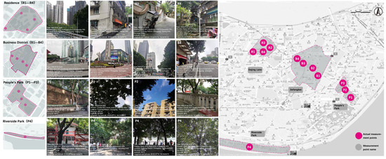 Considering different types of urban functional spaces to determine the measurement points, the twelve experimental measurement points cover four types of urban spaces in three categories: commercial area (Jiefangbei), residential area (Dajing Lane), mountainous park area (People’s Park), and waterfront park area (Riverside Park), the vegetation in the commercial area is sporadically distributed, the vegetation in the residential area is unevenly distributed among the measurement points, and the vegetation in the mountain park area and the waterfront park area are more dense and uniform, as shown in Table 1, Figure 2 and Figure 3 for each measurement point. According to the definition of the high-temperature heat waves by the China Meteorological Administration, the actual measurement of thermal environment data was carried out in a typical high-temperature heat wave cycle in Chongqing (2020.8.4–8.6, with the maximum temperature of 37 °C, 38 °C and 38 °C for three days), and the experimental period was 9:00–20:00. Due to the large number of measurement points and the limited number of instruments, the Dajing Lane measurement point used the American OREGON SCIENTIFIC WMR300 professional meteorological system and thermal radiometer, and the rest of the measurement points used Testo series measuring instruments, in order to ensure that all measurement points were measured simultaneously. Through thermal environment data collection and analysis, the impact of high-temperature heat waves on different urban functional spaces was studied.
