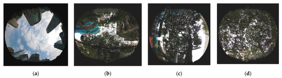 Representative sky fisheye photos of the four measurement areas: (a) is the Jiefangbei measurement point; (b) is the Dajing Lane measurement point; (c) is the People’s Park measurement point; (d) is the Riverside Park measurement point.