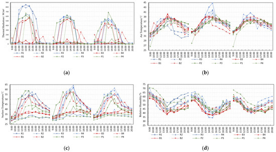 Folding line diagram of thermal environment factors for each measurement point: (a) Thermal Radiation; (b) Air Temperature; (c) Surface Temperature; (d) Relative Humidity.