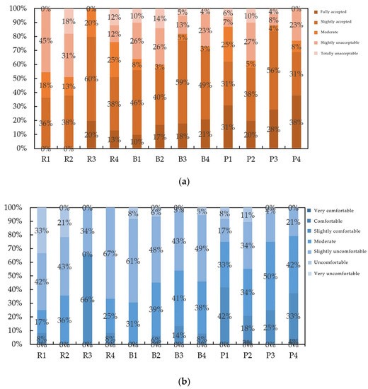 The ages of the questionnaire respondents ranged from 6 to 89 years old, with the majority being between 36–59 years old and the proportion of men and women essentially equal. Figure 6 shows the distribution of thermal comfort votes (TCV), with 46–69% of people voting “slightly uncomfortable” to “uncomfortable” in four measurement points (B1–B4) in Jiefangbei and three measurement points (R1, R2, R4) in Dajing Lane; 52–80% of respondents voted “slightly uncomfortable” in two parks (P1–P4), 52–80% of respondents voted “moderate” and above, and “comfortable” at P2 (3%) and P4 (4%); however, no respondents chose “very comfortable” and “comfortable” at all points. None of the respondents chose “very comfortable” and “very uncomfortable” for all points. Figure 6 shows the distribution of thermal sensory voting (TSV), with Jiefangbei R1 and R2 having the most “slightly unacceptable” and “not at all acceptable” votes, at 45% and 49%, respectively, and Riverside Park P4 having the most “completely acceptable” votes (38%). “Acceptable” accounted for the most (38%). R1 and R2 measurement points of Dajing Lane had no “fully accepted”. This shows that, like the previous thermal environment parameters, the thermal sensation and thermal comfort of the crowd are also affected by different spatial elements. The park provides abundant shade areas, and people feel more comfortable in shady places, while the square in the urban commercial area and the activity site in the residential area have more hard surfaces and less vegetation, and the external air conditioner generates a lot of heat, so most respondents have poor thermal comfort.
