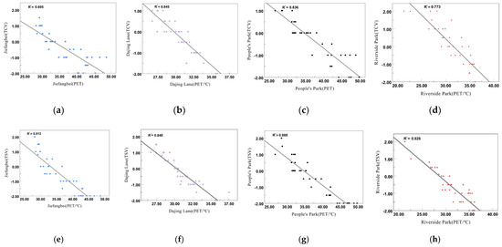 Analysis of the mean thermal sensory vote (TSV) and mean thermal comfort vote (TCV) and PET fit for each measurement area: (a) Jiefangbei (TCV); (b) Dajing Lane (TCV); (c) People’s Park (TCV); (d) Riverside Park (TCV); (e) Jiefangbei (TSV); (f) Dajing Lane (TSV) (g) People’s Park (TSV); (h) Riverside Park (TSV).