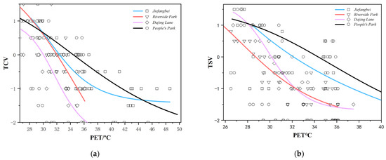 Nonlinear fitting of crowd heat voting to PET: (a) Relationship between TCV and PET for thermal comfort voting in each measurement area; (b) Relationship between TSV and PET for thermal sensory voting in each measurement area.