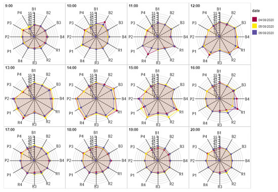 Figure 9 visualizes the changes of PET at twelve measurement points in four measurement areas during one day (9:00–20:00). Most of the measurement points showed a trend of increasing and then decreasing, and a few of them showed a flat change during the day, which is consistent with the trend of the measured data of thermal radiation and air temperature above. Within the measurement period, the PET at each point in the typical summer space of Chongqing’s Yuzhong District during the heat wave was the lowest at 20:00, indicating that the human thermal comfort was the best at this time. The highest point appeared at the residential area R1 (57.8 °C), and the lowest point was P4 in Riverside Park (21.3 °C). Compared with other measurement points, the PET values at five measurement points B1, B2, R3, P3, and P4 were lower and more stable, which is consistent with the fact that these sites have good shading conditions and fast heat dissipation on the lower cushion. Site R1 (Dajing Lane residential area) maintained a high index for three days, which is related to its highest elevation, increased direct sunlight and cramped streets. Site P4 (Riverside Park) had a stable and comfortable PET index for three days, and its shading conditions were the best among all sites. It can be seen that there is a corresponding connection between PET values and urban spatial elements.