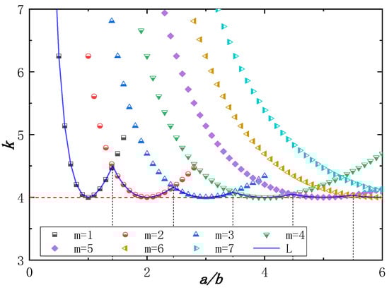 As shown in Figure 2, for the plate under the unidirectional stress, the envelope curve indicates that the number of buckling half-wave (m) and the height-width ratio of the plate () have synergistic effects on the buckling coefficient (). Meanwhile, with the increase of and m, the buckling coefficient () gradually decreases and then infinitely closes to 4.