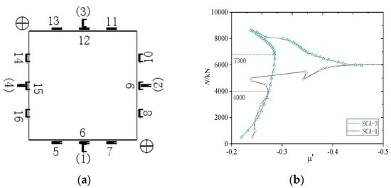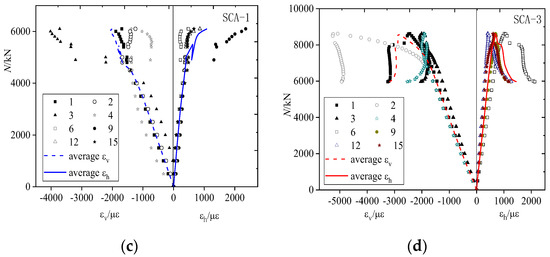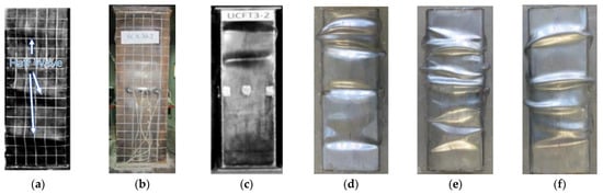 To compare and research the relationship between the buckling half-wave and loading, we have designed a rectangular CSFT short column with 300 × 300 × 900 mm, and the thickness of the steel tube is 4 mm, then the axial compression test has been conducted. The experimental results can be plotted in Figure 6. During the process of the experiment, in the early stage, there is no obvious deformation which occurred in the component, the nominal Poisson’s ratio shows linear change with the increasing loading (Figure 6b). Then, when the experimental loading has achieved about 60% of the ultimate bearing capacity, the longitudinal strain will decrease, the turning point has occurred in the curve, the turning phenomenon can be owed to the elastic deformation of the plate, namely, the elastic buckling has emerged in the plate. After that, when the experimental loading has achieved about 80% of the ultimate bearing capacity, it is obvious that the buckling has occurred in the surface at the concentrated position of the slip line, and the stress-strain curves of different sides show a bifurcation phenomenon (Figure 6c,d), where the turning point has occurred in the nominal strain curve (Figure 6b). This situation is caused by the dislocated buckling in the side plate; meanwhile, the buckling half-wave in the surface shows a growth trend with the increasing loading, as well as the more obvious buckling phenomenon.