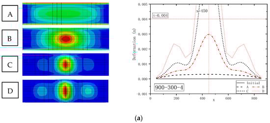 To investigate the buckling behavior of steel tubes in detail, in this section, ABAQUS [3,24] is utilized to simulate the components. Three rectangular CSFT short column models with different height-width ratios (3:1, 4:1, and 5:1 [25]) have been simulated, and then, under the condition of axial loading, we analyzed the changing relationship of buckling deformation in the surface of the side plate. For the internal concrete, the material property of C30 concrete and the concrete damage plastic constitutive model are adopted; the steel is Q345 steel with the bilinear elastic-plastic constitutive model. Other parameters for the analysis can be referred to Ref. [15]. Thus, the element of the concrete adopts the eight-node three-dimensional solid Unit C3D8. The outer steel tube adopts the shell thermal analysis Unit S4R. The contact type among the steel tube and core concrete is set to tangential behavior, and the friction coefficient is 0.3. The buckling behavior of the side plate of the steel tube has been illustrated in Figure 7.