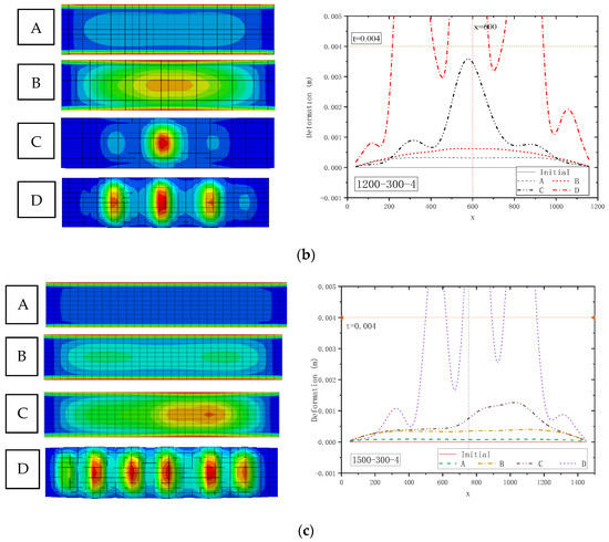 Buckling deformation forms of the side plate under different height-width ratios (A–C are the change of buckling deformation in the loading process, D is the final form). (a) 300 × 300 × 900, t = 4. (b) 300 × 300 × 1200, t = 4. (c) 300 × 300 × 1500, t = 4.