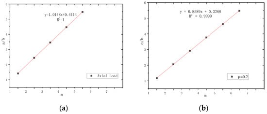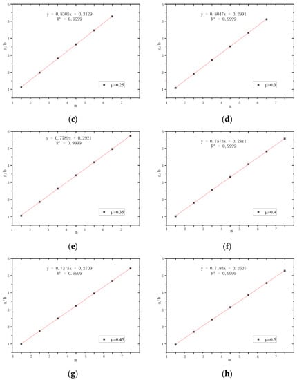 The intersection points of the adjacent m-curve (Figure 3 and Figure 4) are picked and listed in Table 2, and then to obtain the linear fitting of data (Figure 8. As shown in Table 2 and Figure 8, the following conclusion can be summarized: When the value of m has risen, the corresponding slope of remains unchanged, which means for the same condition, the value of is the main factor to influence the number of buckling half-wave. It can be summarized that when the value of b keeps unchanged, the more larger a, the more larger m. In addition, the equidistant growth trend also verifies that the wavelengths of elastic buckling half-waves in the plate should be equal, namely, the wavelengths are all equal to the interval.