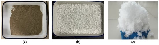 Sand, EPS beads, and flocculent EPE materials. (a) Sand; (b) EPS beads; (c) flocculent EPE.