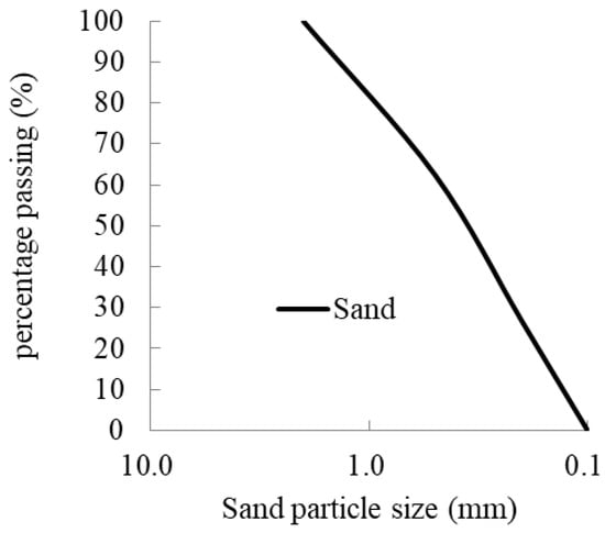 The materials were river sand and EPS beads for construction, as shown in Figure 3. The maximum and minimum values of the dry unit weight were 16.26 kN/m3 and 14.21 kN/m3, respectively. The specific gravity of the sand was 2.63. The particle size distribution curve of the sand is as shown in Figure 4. EPS was a spherical bead geofoam with a particle size of 3–5 mm, as shown in Figure 3b. The materials included pure sand and the sand–EPS-beads mixture.