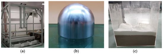 A test device designed by authors was used to perform the impact testing, as shown in Figure 5a. The impact test device consists of a fixed metal frame, a sucker electromagnet, a data acquisition instrument, a falling hammer, and an acceleration sensor. The maximum falling height of the falling hammer is 2 m. The falling hammer with a mass of 1.041 kg is steel with a radius of the front hemisphere of 32.3 mm, as shown in Figure 5b. The sand–geofoam composite materials were placed in a box with a dimension of 300 mm × 300 mm × 300 mm made of acrylic, as shown in Figure 5c. The box was inhibited in the lateral direction. The acceleration sensor was placed on the impact surface to measure the impact force of the falling hammer.