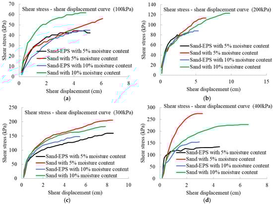 Shear-stress–shear displacement curves for sand and sand–EPS mixture materials with different moisture contents are shown in Figure 6. In general, the shear stress of the sand decreased with the increase in the moisture content. When the moisture content was 5%, the shear stresses reached stable values at the shear displacements of 6.10 cm, 5.42 cm, 7.32 cm, and 2.58 cm under the normal stresses of 100 kPa, 200 kPa, 300 kPa, and 400 kPa, respectively. For the moisture content of 10%, the corresponding shear displacements were 2.90 cm, 8.58 cm, 7.82 cm, and 6.01 cm, respectively, when the shear stresses reached stable values. For the sand–EPS mixture material, the shear stress of sand–EPS with 5% moisture content was larger than that of sand–EPS with 10% moisture content under the small normal stresses of 100 kPa and 200 kPa, while the opposite law was observed at large normal stresses of 300 kPa and 400 kPa. When the moisture content was 5%, the shear stresses reached stable values at the shear displacements of 2.98 cm, 3.35 cm, 7.78 cm, and 2.69 cm under the normal stress of 100 kPa, 200 kPa, 300 kPa, and 400 kPa, respectively, and 3.77 cm, 4.73 cm, 5.03 cm and 2.36 cm for the moisture content of 10%, respectively, when the shear stresses reached stable values. For sand–EPS, with the increase in the moisture content, when the shear stress reached a stable value, the corresponding shear displacement was larger under the small normal stress, but it was the opposite under the large normal stress. For the sand, it had the opposite law with sand–EPS. The reason may be that EPS has small water absorption. Under the small normal stress, the increased water was mainly in the sand, which reduced the friction between sand and EPS. Therefore, with the increase in the moisture content, the shear displacement increased when the shear stress reached a stable value. However, under the high normal stress, the high stress increased the contact between sand and EPS, and the influence of the moisture content on the friction between sand and EPS did not play such a significant role. When the shear stress reached the stable value, the shear displacement of sand–EPS with 5% moisture content was smaller than that of the sand with the same moisture content at the small normal stress, and it was the opposite at the large normal stress. However, when the moisture content was 10%, it had the opposite law.