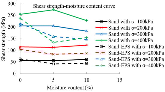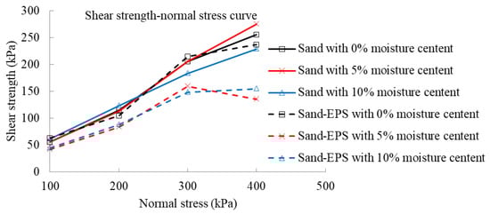 Shear-strength–moisture content curves under different normal stresses are shown in Figure 7. On the whole, the shear strength of the sand was greater than that of sand–EPS mixture material. Under the small normal stress, the shear strength of the sand–EPS mixture material decreased with the increase in the moisture content. Under the normal stresses of 100 kPa and 200 kPa, the shear strength decreased by 29.2% and 16.1%, respectively, when the moisture content was 10%. The shear strength tended to a constant value when the moisture content was 10%. Under the large normal stress, the shear strength first decreased, and then increased with the increase in the moisture content, but it generally decreased. Under the normal stresses of 300 kPa and 400 kPa, the shear strength decreased by 31.3% and 34.7%, respectively, when the moisture content was 10%. With the increase in the moisture content, the shear strength of the sand increased under the small normal stress. Under the normal stresses of 100 kPa and 200 kPa, the increase percentages were 10% and 6.7%, respectively. The shear strength of the sand first increased, and then decreased under the normal stresses of 300 kPa and 400 kPa. The decreased percentages were 10.9% and 10.5%, respectively. At 5% moisture content, the shear strength increased by 10% and 6.7% under the normal stresses of 100 kPa and 200 kPa, respectively. The shear strength of the sand with 5% moisture content decreased by 10.9% and 16.8% under the normal stresses of 300 kPa and 400 kPa, respectively, compared with the sand with 10% moisture content.