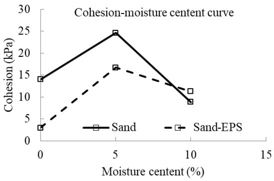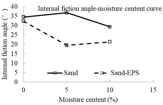The internal-friction-angle–moisture cohesion–moisture curves are listed in Figure 9 and Figure 10. After adding EPS into sand, the internal friction angle of sand–EPS was smaller than that of the sand. The reason may be that the angular sand particles were replaced by spherical smooth EPS beads, and the internal friction angle decreased. With the increase in the moisture content, the internal friction angle of sand–EPS decreased first and then increased, and the percentages of the decrease and increase were 39.7% and 9.5%, respectively. With the increase in the moisture content, the variation law of the internal friction angle of the sand was just the opposite, and the percentages of the increase and decrease were 6.5% and 20.4%, respectively. When the moisture contents were 0% and 5%, the cohesion of sand–EPS was smaller than that of sand, decreasing by 78.9% and 32.0%, respectively. However, when the moisture content was 10%, the cohesion of sand–EPS was greater than that of the sand. The reason may be as follows. Affected by the moisture content, the cohesion was generally reduced. The study of Deng and Xiao [] pointed out that the stiffness of sand grains is much higher than EPS beads. Sand particles will be partially or wholly embedded into EPS beads after compression, which forms a bond effect. The greater the embedment, the stronger the bond effect, which will increase the cohesion of sand–EPS. Therefore, when the moisture content is high, the sand will be mostly or wholly embedded into EPS beads after the sand is pressed. Therefore, when the moisture content was 10%, the cohesion of sand–EPS was larger than that of the sand, with an increase of 27.7%. With the increase in the moisture content, the cohesion of sand–EPS and the sand first increased and then decreased. The increase and decrease percentages of sand–EPS were 466.2% and 32.5%, respectively, and the corresponding increase and decrease percentages of the sand were 75.8% and 64.0%, respectively. By comparing the shear strengths of the same material with 0% and 10% moisture content, the shear strength of sand–EPS increased by 282.2%, while the shear strength of the sand decreased by 36.8%.