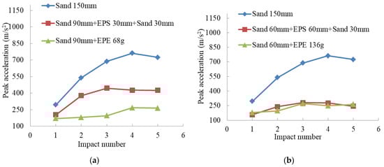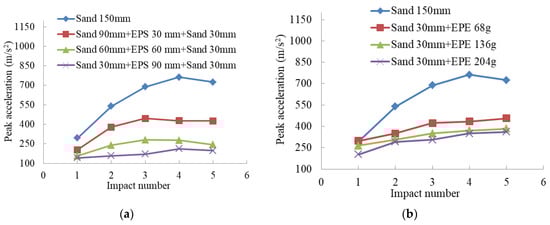 The peak acceleration curves for the sand–EPS and sand–EPE composite cushions with different geofoam quantities under the 1.5 m impact height are drawn as shown in Figure 12. The peak accelerations in the sand–EPS and the sand–EPE composite cushions were much smaller than those in the pure sand cushion. The maximum peak accelerations in the sand, the sand–EPS, and the sand–EPE cushions were 762.1 m/s2, 445 m/s2, and 455.4 m/s2, respectively. The composite cushion had much better buffer performance. The maximum percentage reductions of the peak accelerations of the sand–EPS and the sand–EPE composite cushions relative to the pure sand cushion were 302.4% and 125.3%, respectively, as shown in Figure 13. The peak acceleration reduction percentage of the sand–EPS cushion relative to that of the pure sand cushion had a wide variation range from 42.4% to 302.4%. When the thickness of the bottom layer of the sand was 90 mm, the reduction percentage of the peak acceleration was the largest. However, the difference in reduction percentage for the sand–EPE composite cushion was smaller, from −11.2% to 125.3%, and the reason was mainly that the thickness of the bottom layer of the sand in the sand–EPS composite cushion was inconsistent (Figure 12a), and the peak acceleration was related to the position of the geofoam cushion, which is discussed in the following section.