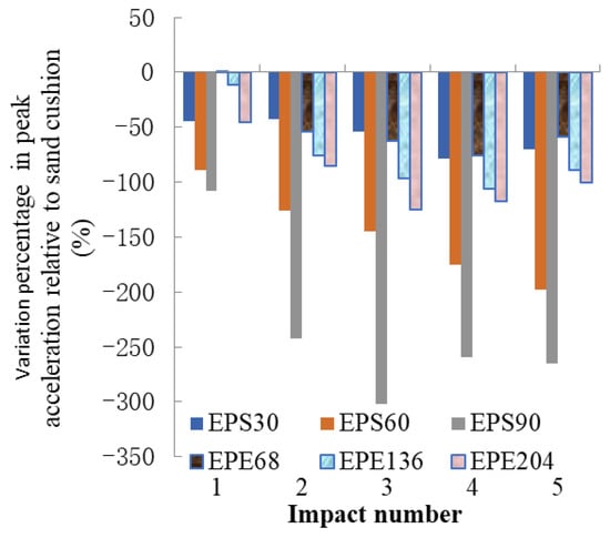 With the increase in the impact number, the peak acceleration was similar to that of the pure sand cushion, as shown in Figure 12 and Figure 14. The peak acceleration gradually increased and tended to a constant value after the impact number reached five times. With the increase in geofoam thickness or weight, the peak acceleration decreased, and the cushion had better buffer performance. However, the percentage increase in the peak acceleration in the sand–geofoam composite cushion was less than that in the pure sand cushion. In general, in a composite cushion, the sand–EPE composite cushion had a smaller increase percentage of the peak acceleration under each impact relative to the previous impact than the sand–EPS composite cushion. The results showed that the sand–geofoam composite cushion had better durability than the pure sand cushion under multiple impact loading, and the sand–EPE had better durability than the sand–EPS.