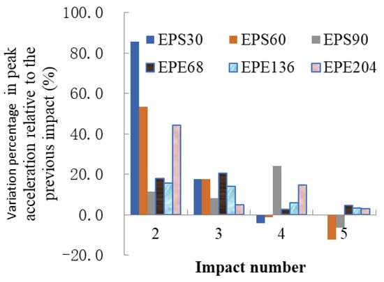 The variation curve of the peak acceleration with the impact number is drawn for EPS and EPE with the same geofoam quality, and the buffer performance of different geofoam types is studied, as shown in Figure 16. Under the same condition, the peak acceleration of the sand–EPE composite cushion was smaller than that of the sand–EPS composite cushion. The maximum difference percentage reached 137.7%. Compared with the peak acceleration under the previous impact, the peak acceleration increase value in the sand–EPE cushion was smaller than that in the sand–EPS cushion, and the curve was relatively flat, indicating that the sand–EPE had better durability under multiple impact loads.