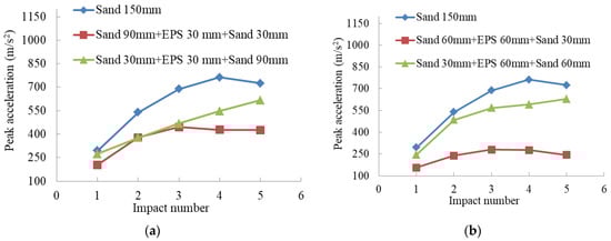 The geofoam thickness remained unchanged, and the geofoam position was changed by varying the thickness of the bottom sand. The variation curve of the acceleration with the impact number is shown in Figure 15. As the geofoam cushion was closer to the top, the peak acceleration was smaller, and the buffer performance of the cushion was better.