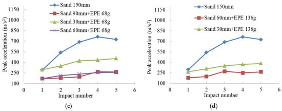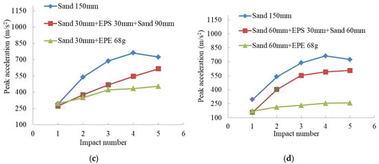 Variation curves of the acceleration with the impact number for different geofoam types. (a) Sand–geofoam with 90 mm sand, 30 mm EPS, and 68 g EPE; (b) sand–EPS with 60 mm sand, 60 mm EPS, and 136 g EPE; (c) sand–geofoam with 30 mm sand, 30 mm EPS, and 68 g EPE; (d) sand–EPS with 60 mm sand, 30 mm EPS, and 68 g EPE.