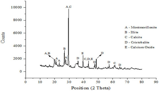 Concrete made with bentonite clay has variable mechanical and durability characteristics depending on the number of different compounds contained in the bentonite clay. According to one study, the chemical composition and particle size of SCM are the most important factors influencing its pozzolanic action [46]. According to previous investigations, the chemical makeup of bentonite clay is shown Table 2. It can be concluded that the primary constituent of bentonite clay is SiO2. Figure 2 depicts the XRD results of BC. The amorphous nature of the silicon dioxide (SiO2) included in bentonite clay has a considerable influence on the performance of concrete, from the initial hydration through the ultimate development of strength. ASTM [47] states that the addition of a chemical (SiO2, CaO, Al2O3, MgO, and Fe2O3) more than 70% can be used as pozzolanic materials as bentonite clay exceeds 70%.