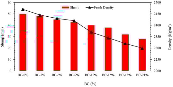 With the inclusion of secondary cementitious materials (SCM), the density of concrete increases due to the micro-filling of gaps in the concrete components which results in a denser concrete mixture. Furthermore, the pozzolanic reaction of SCM improved the binding characteristics of cement paste, resulting in denser concrete [52]. However, some studies reported that a higher dose of SCM leads to a lower density of concrete due to lower workability [35,55]. A study also claimed that, as the BC in the concrete mix is increased, the workability of the concrete mix decreased which increased compaction affords, resulting in the fresh density of the concrete mix decreased [53].