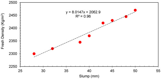 Figure 4 shows a correlation between slump values and the density of concrete. As stated earlier that workability and density are correlated to each other. The lower workability increased the compaction affords and increased the number of voids in hardened concrete, resulting in a decreased density of concrete. As a result, a strong correlation between slump values and concrete density has been observed, with an R2 of greater than 90%.