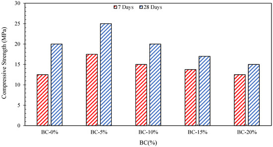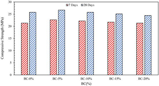 An analysis of compressive capacity gain with various days of curing is also provided in Figure 6, in which the compressive capacity of control concrete is used as a reference concrete. At seven days of curing, concrete compressive capacity is less than 14% from the blank mix at 10% substitution of BC while 20% substitution of BC shows 18% lower than blank mix. At 28 days, compressive capacity is just 4% more than blank mix at 5% substitution of BC while 20% substitution shows 6% lower than the reference strength. It has been established that BC could not improve the compressive capacity effectively but the strength is approximately equal to the reference concrete.