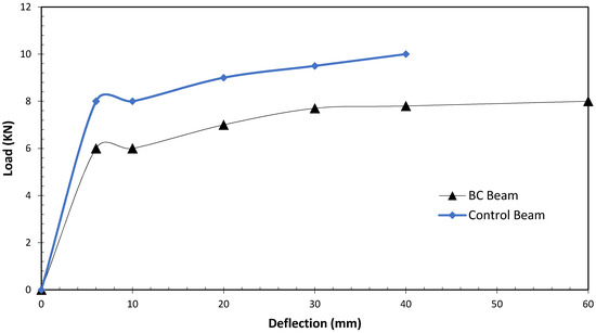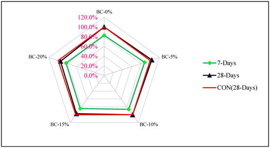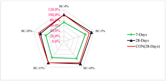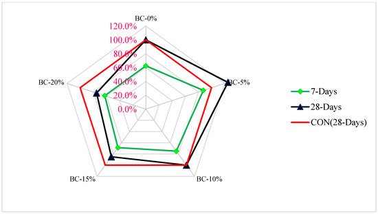 Figure 11 shows the strength age relation of flexure strength with various percentages of BC. The 28 days of reference concrete flexure capacity of concrete was taken as a benchmark flexure strength. At seven days of curing, flexure capacity of 5% replacement of BC is 13% lower than the reference flexure strength (28 days control concrete flexure strength) while 10% substitution of BC shows 25% less than flexure strength to the benchmark flexure strength (28 days blank concrete flexure strength). At 28 days, the flexure capacity of concrete is 25% more than the benchmark flexure strength. The increased flexure strength with the substitution of BC is due to the chemical reaction of BC which increased the binding characteristics of concrete and filling the cavities in concrete components, leading to more dense concrete [35].