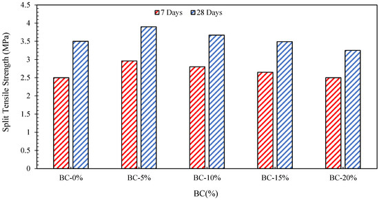 A relative analysis of tensile strength with various days of curing is also shown in Figure 8. The 28 days tensile strength of the blank mix is taken as a reference strength. At seven days, the tensile capacity of concrete is less than 20% from the reference mix at 10% substitution of BC while 20% substitution of BC shows 29% lower split tensile strength than reference strength. At 28 days, tensile capacity is just 9% more than reference strength at 5% substitution of BC while 20% substitution shows 8% less tensile capacity than the reference strength. It has been noted that concrete with a partially substituted BC is still weak in tension.