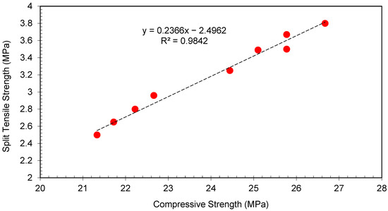 Figure 9 shows a correlation between compressive and tensile capacity of mix with different replacement ratios of BC. Tensile strength depends on the compressive strength of concrete. It is estimated that the tensile capacity of concrete is around 10 to 15 percent of compressive capacity. A high link is existing between the compressive capacity of concrete and its split tensile capacity, even when the BC substitution ratios are varied. The regression model shows an R2 value greater than 90%.
