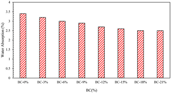 The outcomes of the WA test are shown graphically in Figure 14. The results of the tests revealed that the water absorption reduced as the quantity of cement substituted by BC improved. Due to the chemical reaction among natural pozzolans and CH in hydrated cement paste consuming lime rather than lime producing calcium silicate hydrates (CSH) gel, the binding property of cement paste is increased, resulting in a more compact mass which decreased water absorption of concrete. Secondly, since the grain size of BC is smaller than OPC, it can give more compact mass by micro-filling voids and, as a result, a reduction in water absorption [57,66]. Additionally, research revealed that WA was reduced with BC substitutions of up to 30% [56]. Additionally, according to one research, SCM reduced water absorption due to micro filling, which improved the density of concrete, resulting in lower water absorption. However, with greater doses of BC, an increase in WA was found owing to a lack of flowability, which increased the compaction afforded, resulting in porous concrete, which eventually increased the water absorption of concrete [52].
