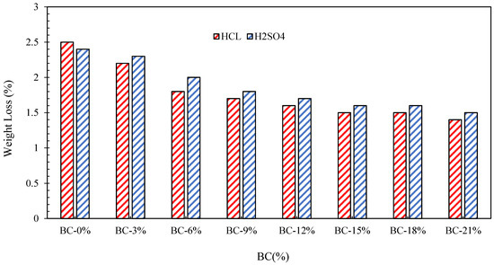 The outcomes of the acid attack test with various replacement ratio of BC are shown in Figure 15. In the laboratory tests, it was discovered that the amount of weight loss experienced by blank mix was greatest in both sulfuric acid (H2SO4) and hydrochloric acid (HCL) solutions. The lower acid resistance of blank mix against acid attack may be attributed that it includes a big quantity of lime and during hydration emits a significant amount of free CH, which interacts with the acid and leaves a soft and mushy material behind. For bentonite mixes, the CH combines with the SiO2 available in BC to produce CSH gel, resulting in a small quantity of CH and improved acid resistance capacity of BC concrete. When comparing the two acid solutions, the weight loss pattern was identical. Sulfuric acid, on the other hand, was shown to cause greater degradation than HCL. The greater degradation of H2SO4 is due to a product known as calcium sufflarninate (Ettringite) is created, which expands and produces rupture of the set cement paste [67]. In the case of hydrochloric acid, no such product is generated. An investigation into Pozzolanic reaction and micro filling SCM resulted in a reduction of cavities, which inhibited the rapid entry of acid. The dissolving of calcium aluminate and calcium hydroxide in concrete due to H2SO4 is the primary cause of erosion [68]. The concrete erosion is determined by the rate at which H2SO4 penetrates into the concrete body and the time it takes to achieve calcium hydroxide and calcium aluminate. As a consequence, a reduction in the voids of concrete due to the replacement of bentonite clay leads to a denser concrete mixture. It is anticipated that increased density will lead to a reduction in the rate of H2S04 penetration into the concrete. However, higher acid resistance was examined at a higher substitution ratio of bentonite clay due to loss of flowability which results in porous concrete. The acid may readily permeate concrete via cavities, resulting in the destruction of the concrete structure. Further, bentonite is one of the most essential ingredients utilized in the construction of plastic concrete, where it serves to stabilize the concrete. It is made of clay components that have strong water absorption and swelling characteristics of 300 percent even after being in touch with water [54]. Swelled BC slurry will fill the voids and these water-saturated BC can block the further water absorption and permeability, thus decreasing the water absorption of water and increasing the acid resistance.