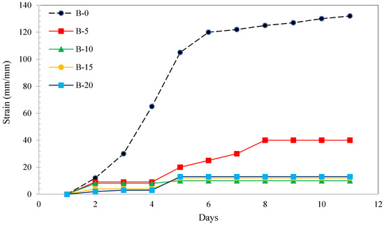 The shrinking of concrete is induced by the loss of moisture as a result of the drying process. To decrease cracking and the structural movement caused by drying shrinkage in concrete, shrinkage compensating concrete is utilized in its construction. It is dependent on the component materials, mixture proportions, curing time, drying environment, and constraint that the degree of drying shrinkage that happens in concrete buildings is determined. A study claims that the shrinkage of concrete is due to the movement of cement paste while aggregate restricts the movement of cement paste [55]. The findings of dry shrinkage of the five samples evaluated for initial days of hardening are assessed for evaluation. These specimens are the reference concrete, 5% BC, 10% BC, 15% BC, and 20% BC, respectively. Results indicate that the reference concrete experienced a large shrinkage when compared to the total amount of shrinkage experienced by all of the bentonite mixes. The maximal value of autogenous shrinkage strain obtained by the control mix was 135 macro strains. The shrinkage in B-5 and B-10 was 40 macro strain or 31 percent and 11 percent, respectively, but the shrinkage in B-15 and B-20 was 14 percent and 14 percent, respectively (Figure 16). The B-10 specimen produced the best results in terms of autogenous shrinkage strain. These findings are quite encouraging in terms of the decrease in linear shrinkage that may be obtained with the substitution of bentonite. The overall testing duration for the concrete beams was ten days, and no substantial fluctuation in autogenous strain was recorded beyond that time. The combined pozzolanic reaction and micro filling of mineral admixture improved the cement paste binding properties and density which ultimately decreased the dry shrinkage of concrete [57]. A study noted that the reduction of cement content in cement pastes results in a decrease in drying shrinkage of cement pastes [69]. In addition, the research found that the mineral additive lowered the heat of hydration which prevented the quick evaporation of water from the concrete surface and decreased the formation of dry shrinkage cracks [70]. It has also been observed that fly ash may significantly minimize drying shrinkage in concrete by plugging micropores in the concrete and hence increasing the internal compactness of the concrete mix [19].