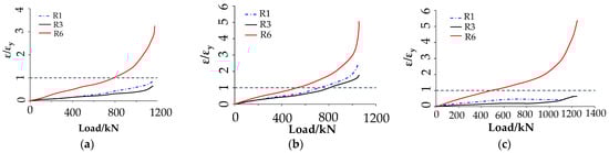 The load-strain behaviors of the specimens were investigated by the three representative Specimens SC-1, SC-2, and SC-5. Three strain gauges were picked for the three specimens, two at the top column and one at the lower column. The strain-displacement curves of the specimens are shown in Figure 13a–c, respectively. The strain data corresponding to ultimate load of the specimens were picked, as shown in Figure 13d–f, respectively. It should be noted that εy denotes the yield strain of steel.