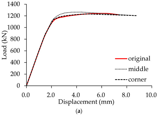 According to the failure mode investigated above, the failure of the specimens was caused by the local buckling of the column rather than the corner fitting. Therefore, an optimization of the corner fitting is needed. In this way, the weight of the corner fitting, the location of the column, and the strength, length, and thickness of column were considered as parameters to conduct the parametric study. Table 3 lists the values of the parameters considered in the parametric study. The weight reduction (WR) of the corner fitting introduced in this table is calculated with respect to the specimens tested in this paper. It should be noted that the “0 WR” denotes the original thickness of the corner fitting. The WR of the corner fitting was achieved by reducing the thickness in three dimensions. The models are identified with the notations introduced in Table 3. Three different locations for the column were considered, as shown in Figure 18. The values presented in Table 3 represent the changes in the location and section of the column. The specimens with different strengths and lengths of the column were based on the verified FEM of Specimen SC-4. In total, 53 FEMs were considered in the parametric study.