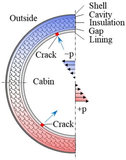 Commercial aircraft are operated in an extreme external environment where the outside air temperature may be as low as −65 °C [1,2]. On flights, the internal cabin air temperature is commonly conditioned to range from 18.2 to 26.7 °C [3,4]. There is a huge temperature difference across aircraft envelope walls. The aircraft envelope wall consists of a shell, cavity, insulation layer, gap, and lining [5], as shown in Figure 1. The fiberglass insulation layer has low thermal conductivity and thus experiences large temperature differences in the cruising stage.
