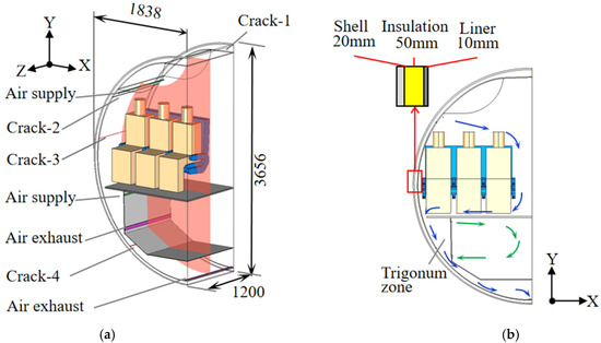 Cracks on the lining are usually at the joints of two lining sheets, such as at the crown of the passenger cabin, the stowage bin, and near the window. We assumed that there were four cracks on the lining of the cabin at different heights, as shown in Figure 2a. Crack 1 was at the crown, Crack 2 was under the stowage bin, Crack 3 was at the lower edge of the window, and Crack 4 was below the cargo cabin. For simplicity, these cracks were assumed to span the whole fuselage. Air in the cabin could be exchanged with air in the envelope walls through these cracks, subject to pressure difference.