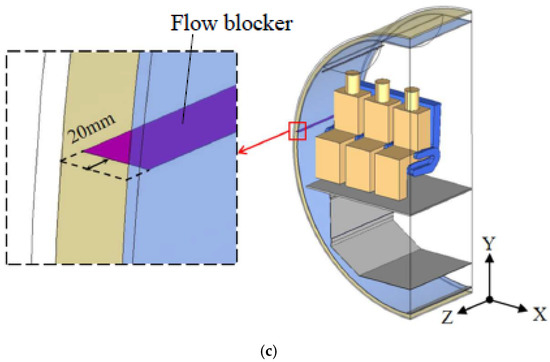 Schematic diagram of half an aircraft cabin model for investigation: (a) 3D diagram, (b) 2D diagram and ventilation flow paths; (c) schematic diagram of flow blocker in Case 16.