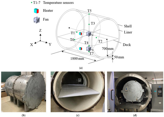 To validate CFD modeling, a measurement test was conducted in a laboratory using a 1:2.5 reduced-scale mockup of an aircraft cabin section, as shown in Figure 3. The cabin section consisted of two cylindrical shells. The outer shell was composed of stainless steel, and had a diameter of 1.5 m and thickness of 0.002 m. The inner shell was composed of polypropylene, and had a diameter of 1.4 m and thickness of 0.005 m. The inner shell surface was similar to the lining sheet on aircraft. There was an air channel with a thickness of 0.05 m between inner and outer shells to simulate the insulation layer of the aircraft. Cabin end faces were composed of stainless steel with a thickness of 0.005 m. The foamed polyurethane with a thickness of 0.05 m was attached to the inner end faces to provide insulation. Inside the cabin, a 7 cm thick perforated board by polypropylene divided the cabin space into an upper and a lower part to simulate the passenger cabin and cargo compartment, respectively, as shown in Figure 3c. Two heaters at 220 W were placed in the upper and the lower cabins, respectively. The heaters maintained the internal air at around 20 °C. Each heater was blown by a fan at a speed of 9 m/s to mix the inner air. The whole cabin mockup was placed in an environmental chamber conditioned to −20 °C, as shown in Figure 3d, to mimic similar temperature conditions to those during flight.