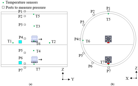 Schematics of temperature and pressure measurement locations: (a) longitudinal sectional view; (b) front cross-sectional view.