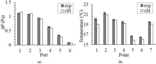 Figure 5 compares the simulated and measured pressure differences and temperatures at different measuring locations. Error bars are standard deviations in three repetitive measurements. The maximal pressure difference was between P1 and P7, and amounted to 1.15 Pa. Minimal pressure difference was between P6 and P7. CFD slightly overpredicted pressure differences at P1 and P2, but slightly underpredicted pressure differences at the remaining ports. The average relative discrepancy between CFD and measurement was 8.84%. Figure 5b presents the temperature comparison. CFD generally slightly underpredicted the temperatures. The maximal deviation in temperature was at Point 1 with a discrepancy of 1.04 °C. CFD thus provided results in excellent agreement with measurements, which validated the accuracy of the CFD modeling.