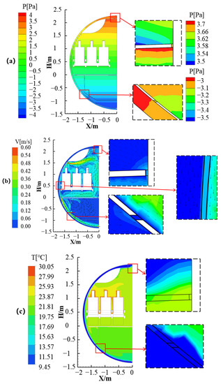 Distribution of air pressure, velocity, and temperature in cross-section of Case 1: (a) pressure, (b) velocity, (c) temperature.