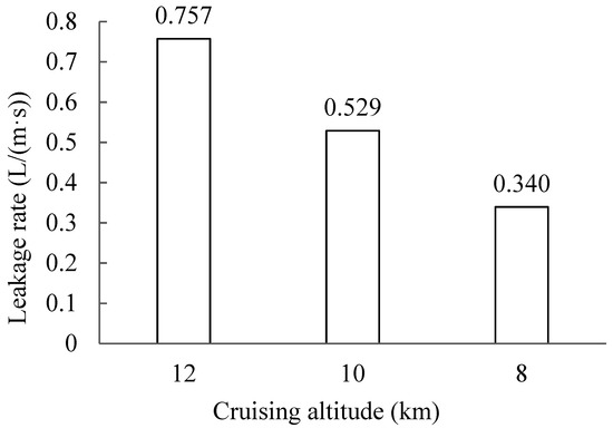 Figure 7 shows the comparison of the leaked-air rate through Crack 1 at different cruising altitudes of a flight, i.e., results of Cases 1 to 3. The leaked-air rate at cruising altitudes of 12, 10, and 8 km was 0.757, 0.529, and 0.340 L/(m·s), respectively. The leaked-air rate increased with cruising altitude. The leaked-air rate at a cruising altitude of 12 km was more than twice that at 8 km. As shown in Table A1 in the Appendix A, the recovery temperature at 12 km was −37.3 °C, while it was −5.6 °C at 8 km. Outside air temperature decreased with altitude. Due to a larger temperature difference at a higher flight altitude, the resulting stack pressure difference was also larger, as shown in Figure 8.