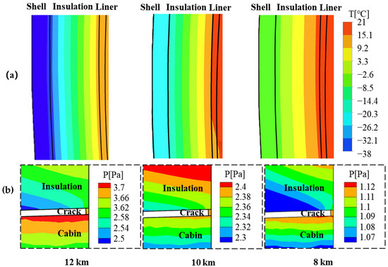 Temperature and pressure distribution under different cruising altitudes of a flight: (a) temperature distribution for a section of the envelope wall, (b) pressure distribution surrounding Crack 1 on the ceiling.