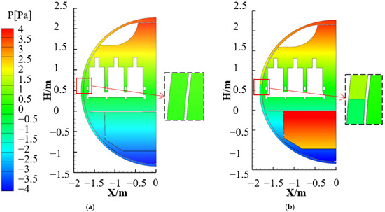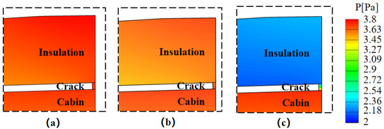 Figure 9 shows the leaked-air rate varying with crack size when comparing Cases 1, 4, and 5. The smaller the crack size was, the lower the leaked-air rate was. However, there was only minimal difference in leaked-air rate between crack sizes 5 and 2.66 mm. The leaked-air rate for 1 mm was less than half of those for 2.66 and 5 mm. The resistance of leakage flow increased with the decrease in crack size. Figure 10 presents pressure distribution with different crack sizes. Pressure distribution in the cabin and around cracks was similar for crack sizes of 5 and 2.66 mm. The pressure inside the insulation layer, on the other hand, was greatly reduced with a crack size of 1 mm. Pressure distribution was consistent with the presented leaked-air rate.