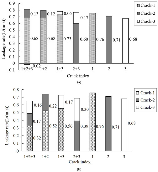 Leaked-air rate when different cracks were in use: (a) each crack with a width of 2.66 mm; (b) the total width of all cracks equaled 2.66 mm.